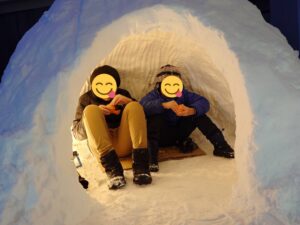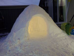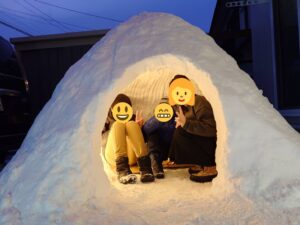 雪の確保の為に自宅の周りまで雪掻きすることになりましたが、風をひかないように休みながら作り3人は入ることの出来るかまくらが完成❗